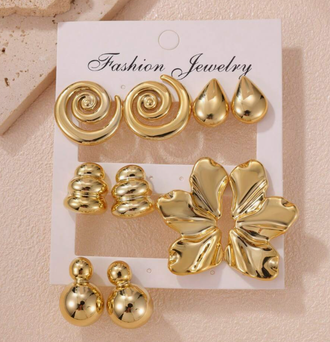 This 10-piece gold stud earring set features a stylish mix of spiral designs, teardrops, hearts, florals, and classic round studs. Bold yet versatile, these earrings are perfect for vacations, parties, or elevating your everyday outfits. Easy to mix and match for chic, eye-catching looks.