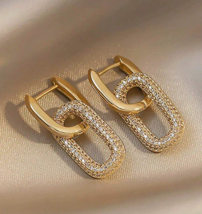 Elegant gold-plated drop earrings featuring a modern geometric link design, accented with sparkling zirconia stones. Sleek, stylish, and easy to dress up or down — perfect for adding a touch of shine to both everyday outfits and evening looks.