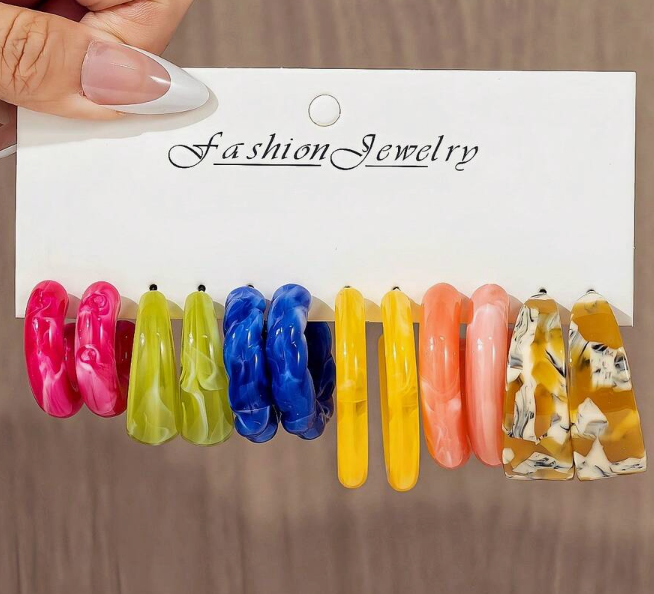 This acrylic hoop earring set features vibrant, glossy designs perfect for mixing and matching with any outfit. Lightweight, fun, and easy to wear — your everyday accessory essentials 🌈