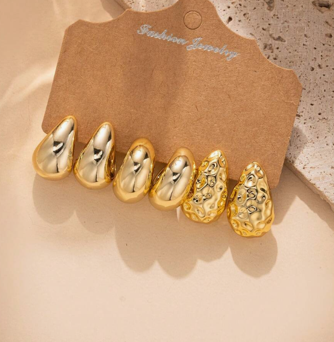 Make a bold yet elegant statement with this geometric gold earring set featuring smooth teardrop silhouettes and textured molten-inspired designs. The mix of high-shine polished finishes and artistic hammered details gives each pair a modern, luxe feel while still being easy to wear.