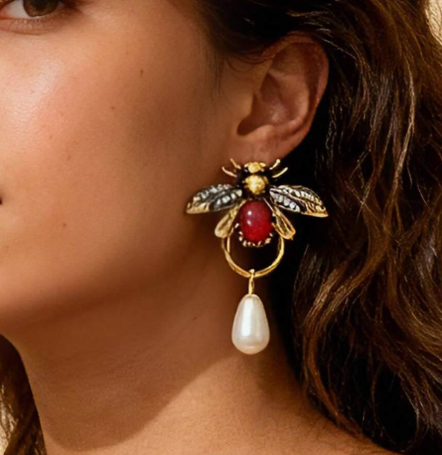 Striking bee-shaped earrings featuring detailed wings, a rich red stone body, and a luminous pearl drop. Finished in gold tones, this unique design blends vintage charm with modern glamour. Perfect for making a statement at parties, special events, or whenever you want your accessories to stand out.