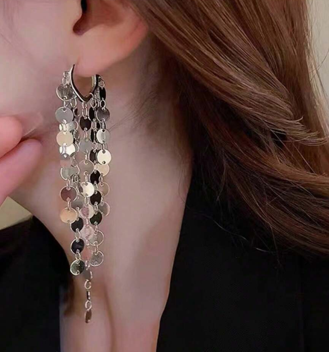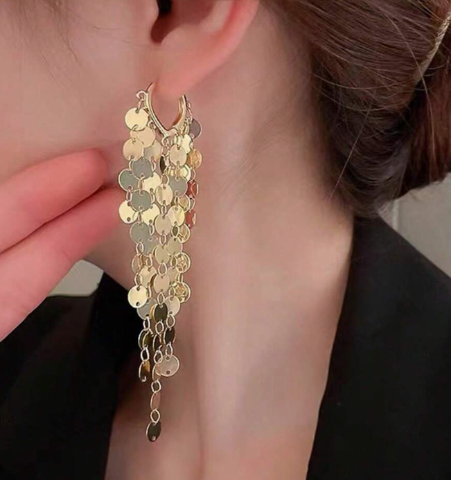 The lightweight coin-shaped pieces catch and reflect the light beautifully with every movement, giving these earrings a radiant, eye-catching sparkle. The layered fringe design adds texture and dimension, making them a perfect statement accessory for both daytime elegance and evening sophistication.