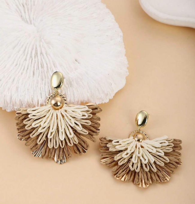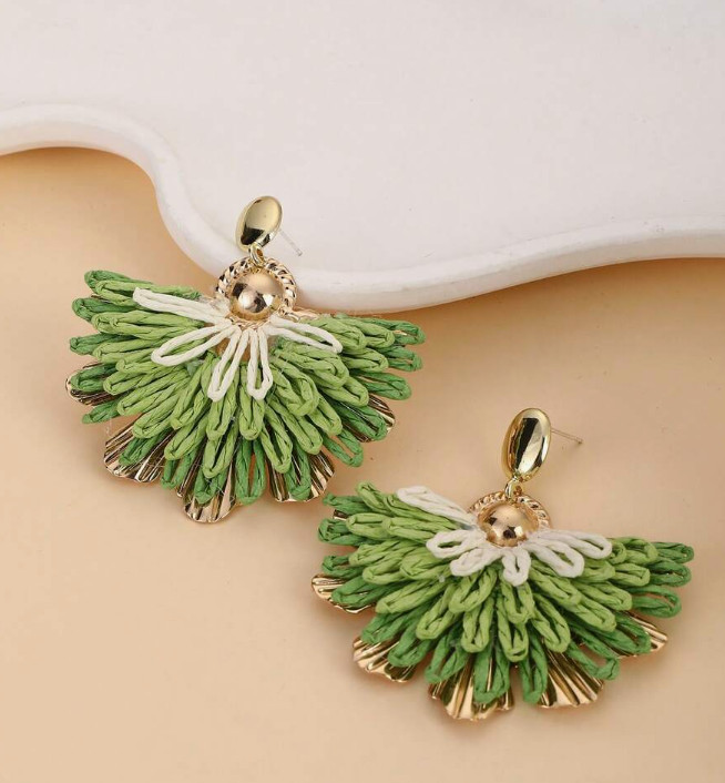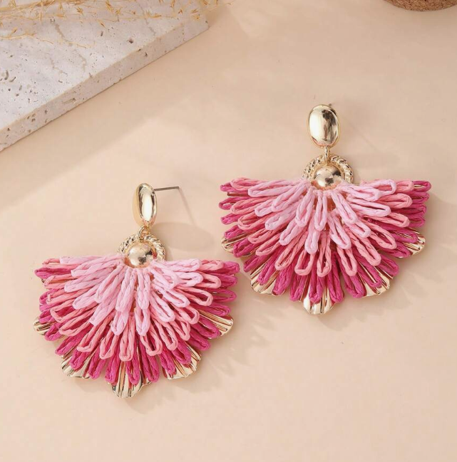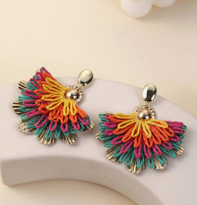 Each pair showcases layered raffia-style petals arranged in a beautiful gradient effect, creating depth, movement, and artistic charm. Lightweight and comfortable to wear, they are perfect for vacations, beach outings, parties, festivals, or adding a playful touch to your everyday outfits.