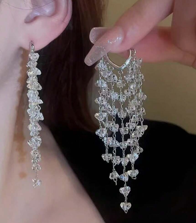 The intricate fringe design adds graceful movement and shimmer with every step, catching the light beautifully from every angle. Crafted in a sleek silver-tone finish, these earrings offer a refined, glass-like sparkle that enhances both daytime and evening looks.