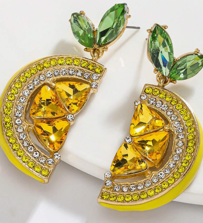 These lemon slice dangle earrings are a juicy statement piece that instantly brightens any outfit. Designed with vibrant yellow crystals, shimmering rhinestones, and leafy green accents, they bring a playful fruity twist with a glam finish. Lightweight yet eye-catching, they’re perfect for vacations, summer parties, brunch dates, or whenever your look needs a pop of sunshine.