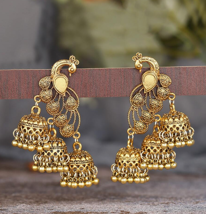 Suspended below the peacock design are intricately crafted dome-shaped bell charms (jhumka style), adorned with fine cutout detailing and tiny dangling gold beads. The layered tassel effect creates graceful movement, producing a soft, eye-catching sway with every step. The combination of structure and fluid motion makes these earrings both dramatic and elegant.