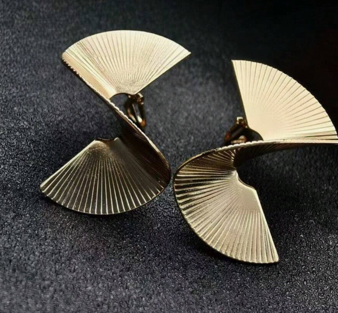 These retro-inspired asymmetrical fan earrings bring instant drama with their sculptural, folded design. The metallic finish catches the light beautifully, while the unique spiral-fan shape gives them that bold, fashion-forward vibe.