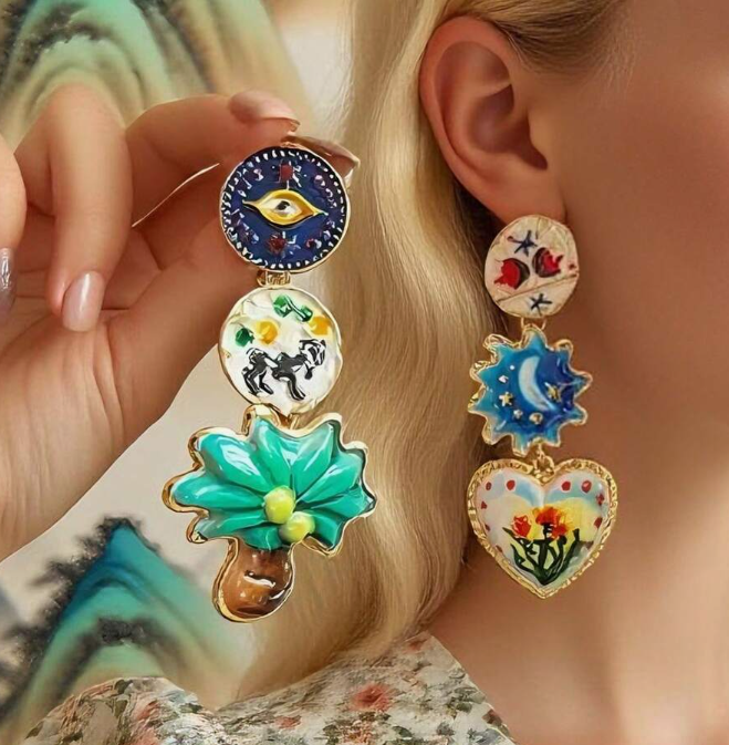 Bold, artistic, and full of personality — these retro-inspired asymmetric earrings are made to stand out. Featuring playful celestial symbols, vibrant florals, and whimsical hand-painted details, each piece tells its own unique story.