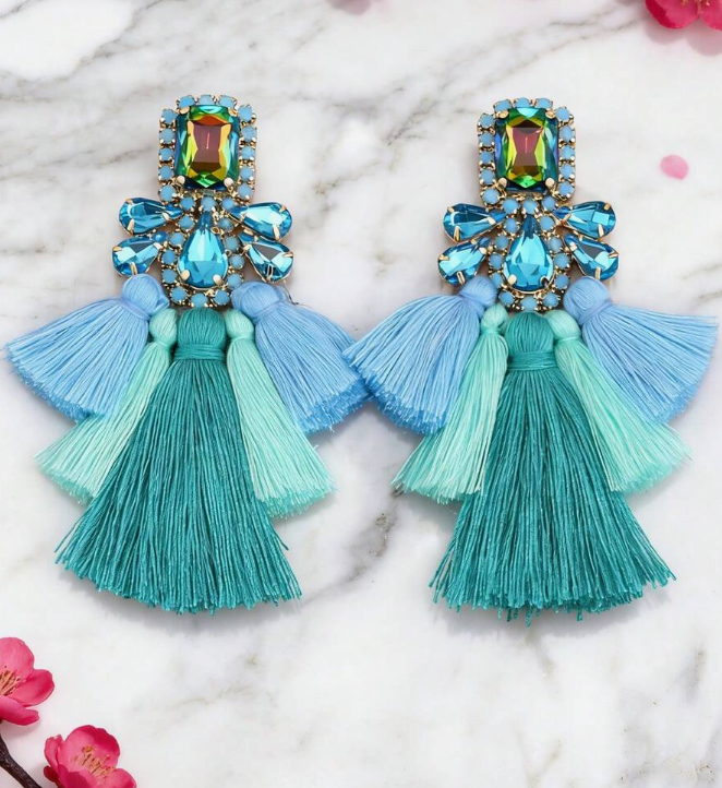 Below the sparkling gemstone cluster, layered teardrop crystals add depth and brilliance, flowing seamlessly into soft, ombré tassels that create beautiful movement with every step. The gradient blend of cool blue and green tones gives these earrings a fresh, ocean-inspired elegance that’s perfect for summer events, weddings, vacations, and festive celebrations.
