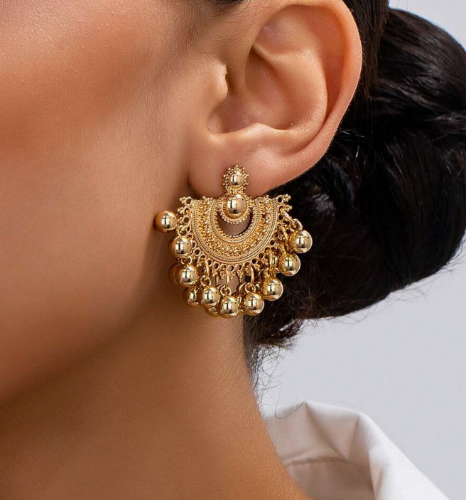 Elevate your festive and occasion wear with these Vintage Hollow Fan-Shaped Bohemian Tassel Earrings, crafted to make a bold and elegant statement. Designed with intricate detailing and a rich gold-tone finish, these earrings beautifully combine traditional artistry with glamorous appeal.